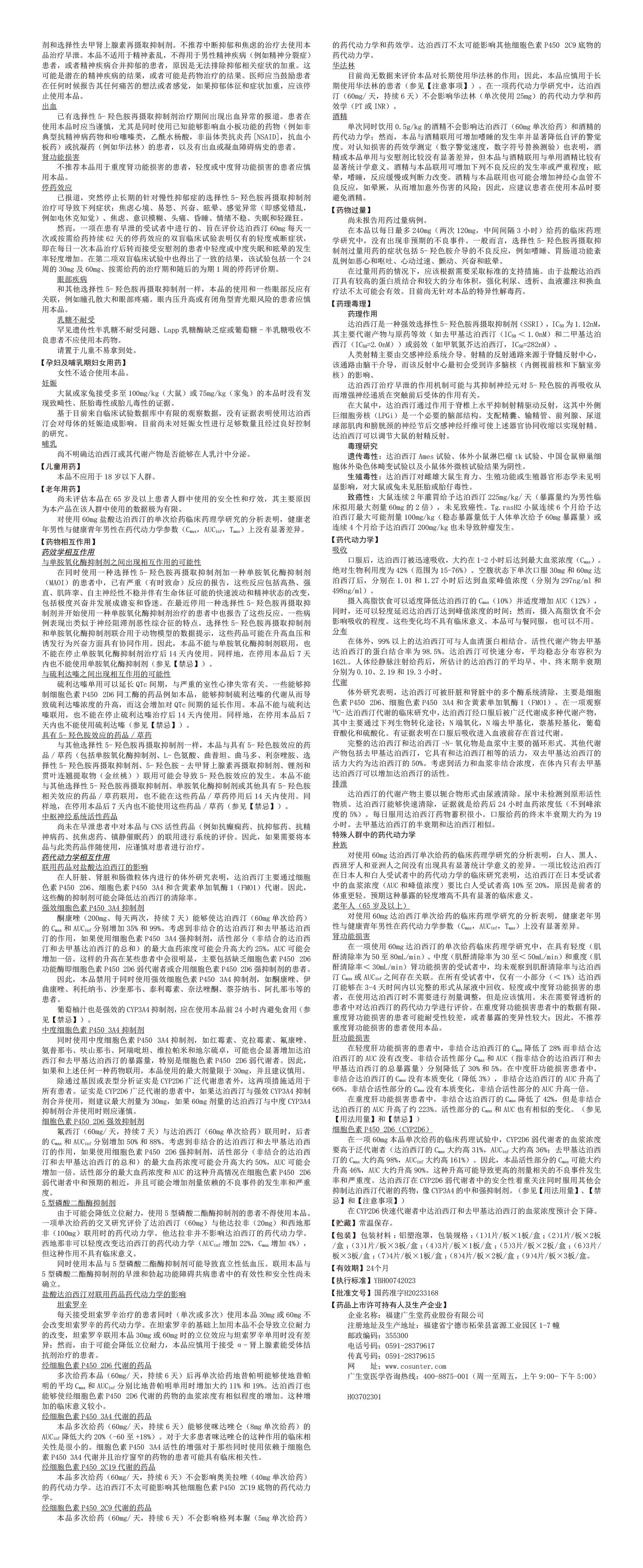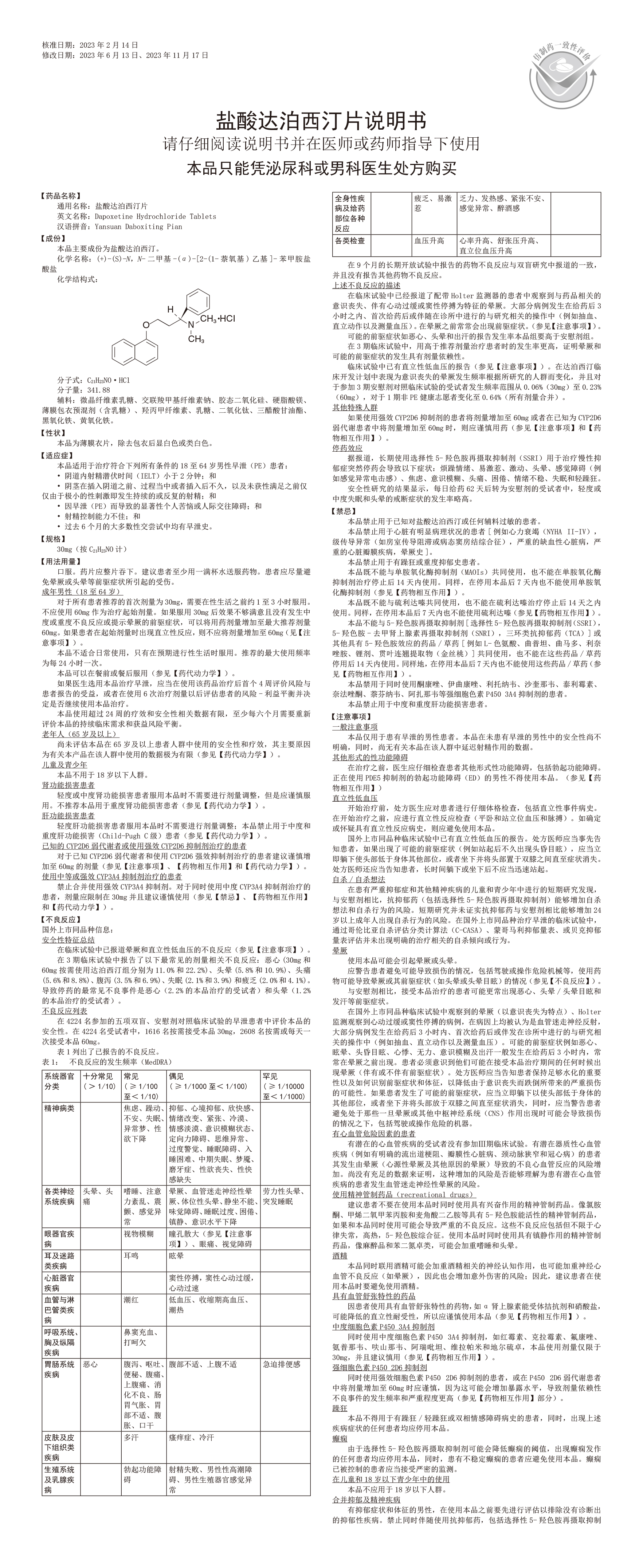 | 藥品名稱: | 通用名稱:鹽酸達泊西汀片 | ||